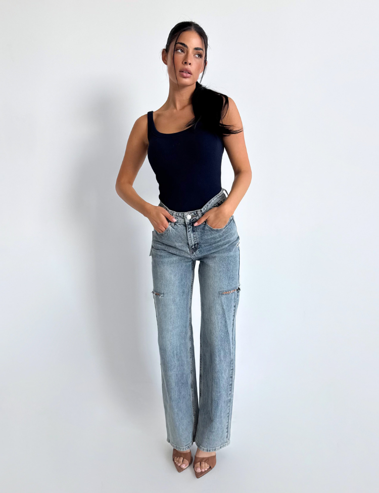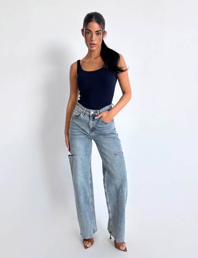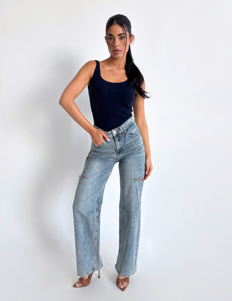 De June Wide Leg Jeans is een must-have voor jouw garderobe. De broek heeft cut out details, stretch en Unique branding. Het model draagt maat 36.