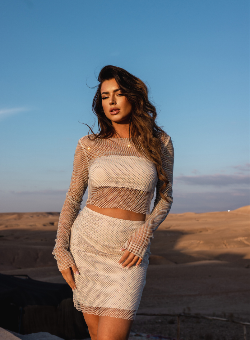 Stand out in our show-stopping Avalon Two Piece Set Short - De set is gemaakt van mesh materiaal en bevat een top met lange mouwen, een rok met mini lengte en is geheel bedekt met rhinestones.