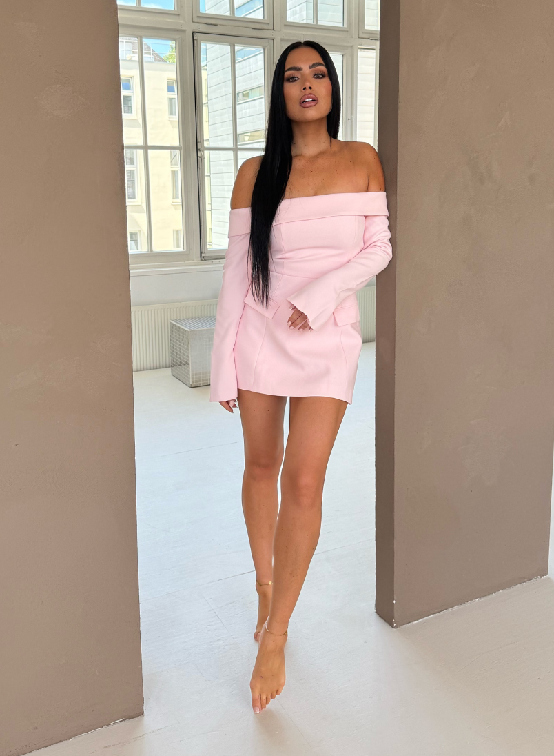 De Emily Dress is een aangesloten, off-shoulder jurk met blazer-details. De jurk heeft een elegante pasvorm en is voorzien van lange mouwen en een rechte, korte rok.