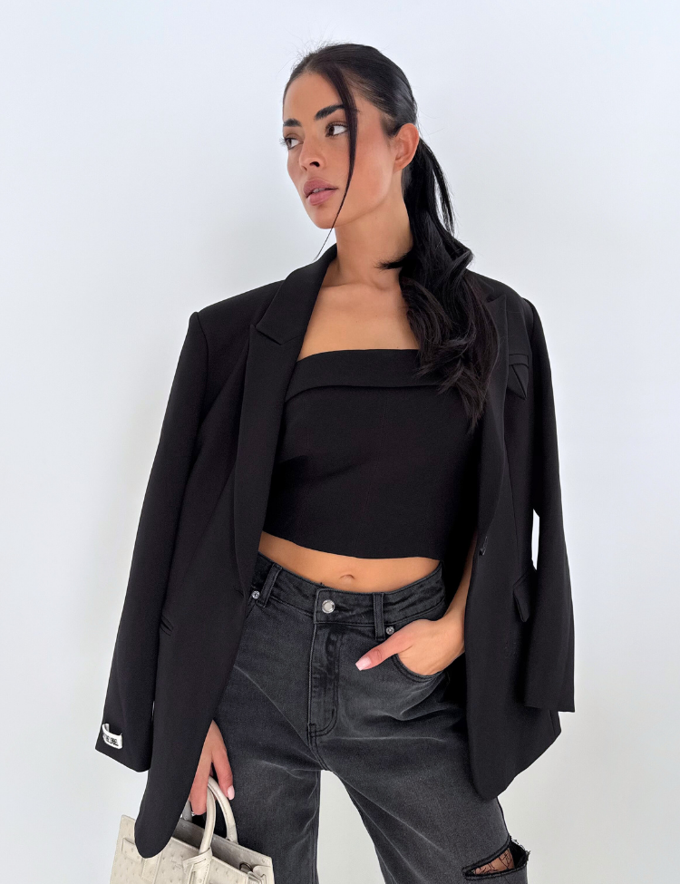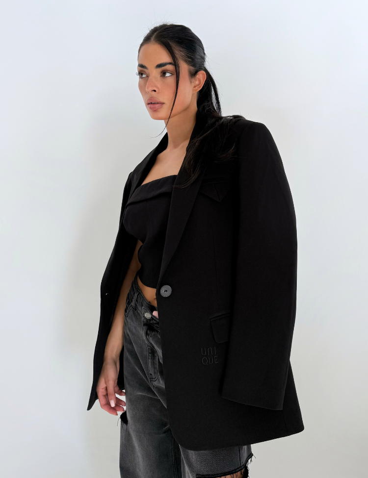 De Novee Blazer – Deep Black van Unique the Label is een moderne klassieker die iedere outfit direct een stijlvolle upgrade geeft. Deze elegante blazer heeft een verfijnde, licht oversized pasvorm die een krachtige maar vrouwelijke look creëert. De diepe zwarte kleur zorgt voor een luxe en tijdloze uitstraling, terwijl de strakke lijnen en nette schouderconstructie de blazer perfect in balans houden.