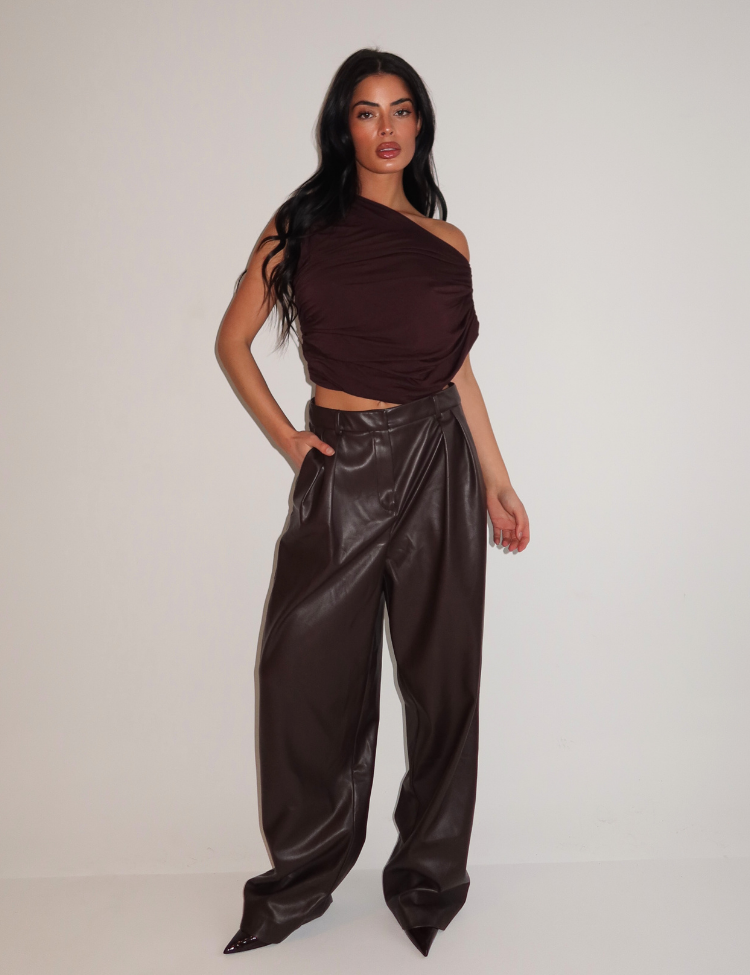 De Ziva Leather Pantalon – Brown is een moderne essential met een clean en verfijnd silhouet. De losvallende pasvorm en subtiele plooien aan de voorzijde zorgen voor een ontspannen, stijlvolle look. De warme bruine kleur geeft de pantalon een zachte, luxe uitstraling en sluit perfect aan bij een frisse pre-spring garderobe.