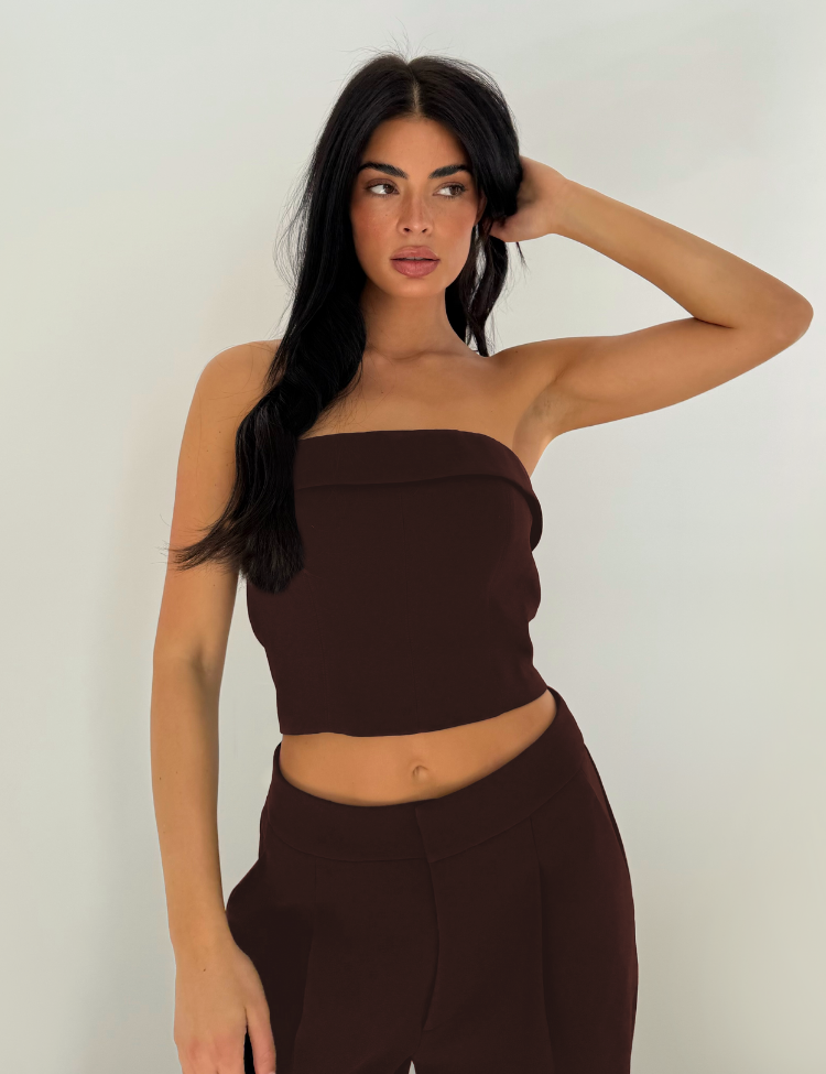 De Yve Top – Cacao van Unique the Label is een stijlvolle en moderne strapless top die jouw look direct een verfijnde, vrouwelijke uitstraling geeft. Het aangesloten model vormt prachtig om het lichaam en de rechte, clean-cut bovenrand zorgt voor een minimalistische en elegante finish. De diepe zwarte kleur en de subtiele structuur van de stof geven de top een luxe uitstraling die moeiteloos met iedere outfit te combineren is.